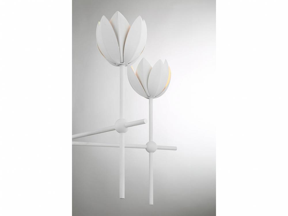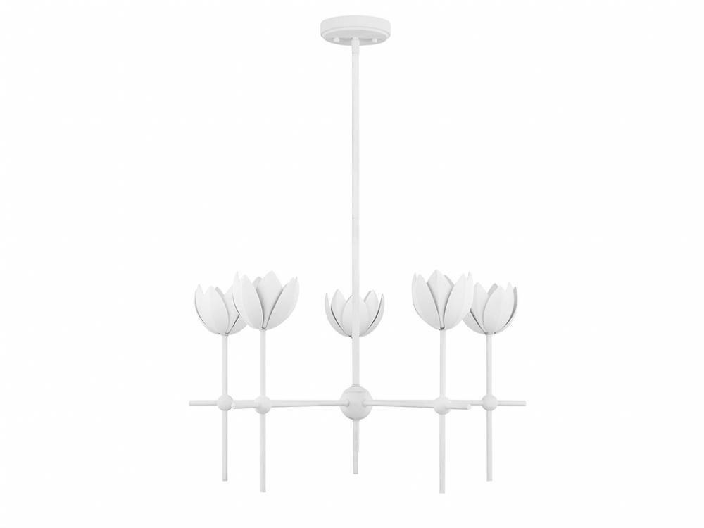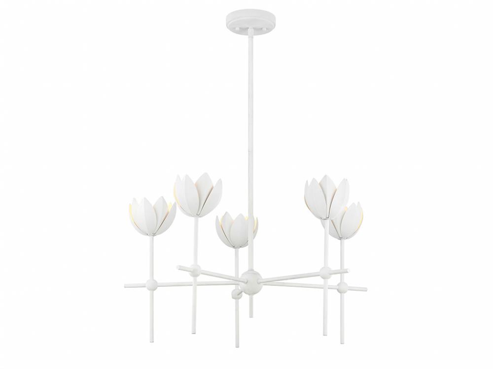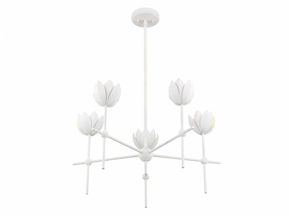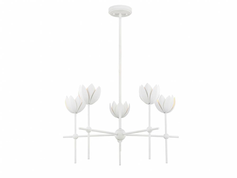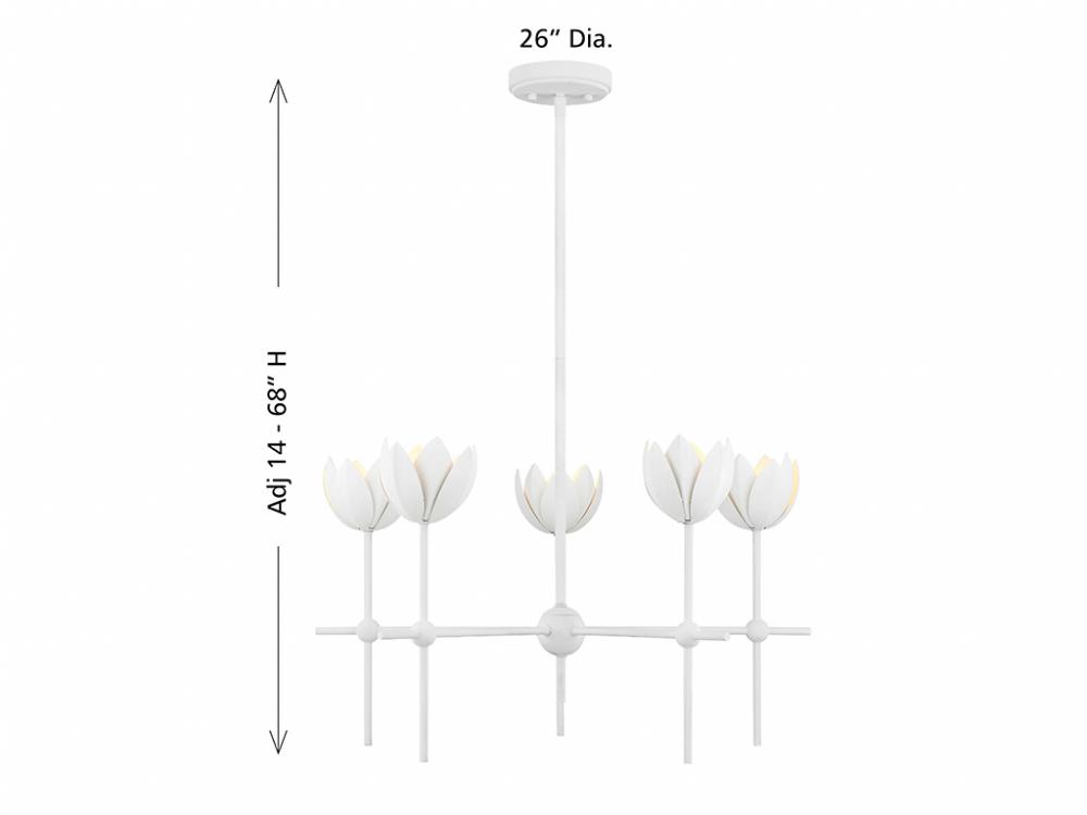 This 5-light chandelier beautifully blossoms forth, infusing your home with organic-meets-modern style. It is illuminated by G9 LED light bulbs and finished in Bisque White. Adjustable height ranges from 14" to 68". Comes with four 12" downrods and one 6" downrod. 26" width. Bulbs not included.