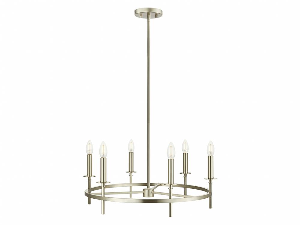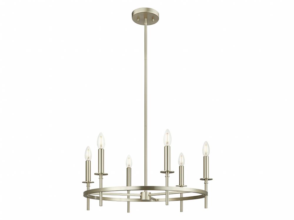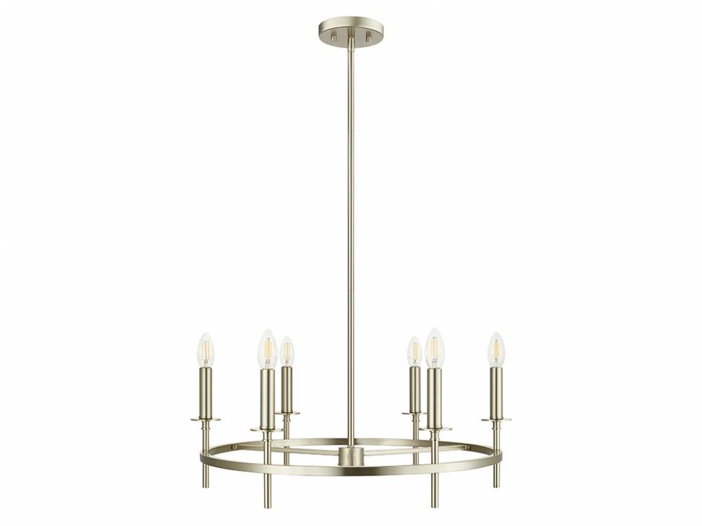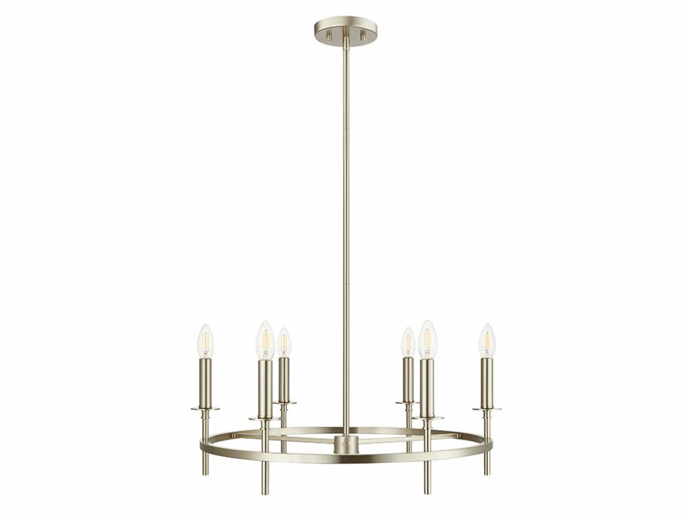 Discover an elegant lighting look with this 6-light chandelier. It showcases an understated style accentuated by stylized bobeches and is dressed in a Brushed Nickel finish. It is 9" in height and 25" in width. Uses six candelabra size bulbs of up to 60 watts per bulb. Bulbs not included.
