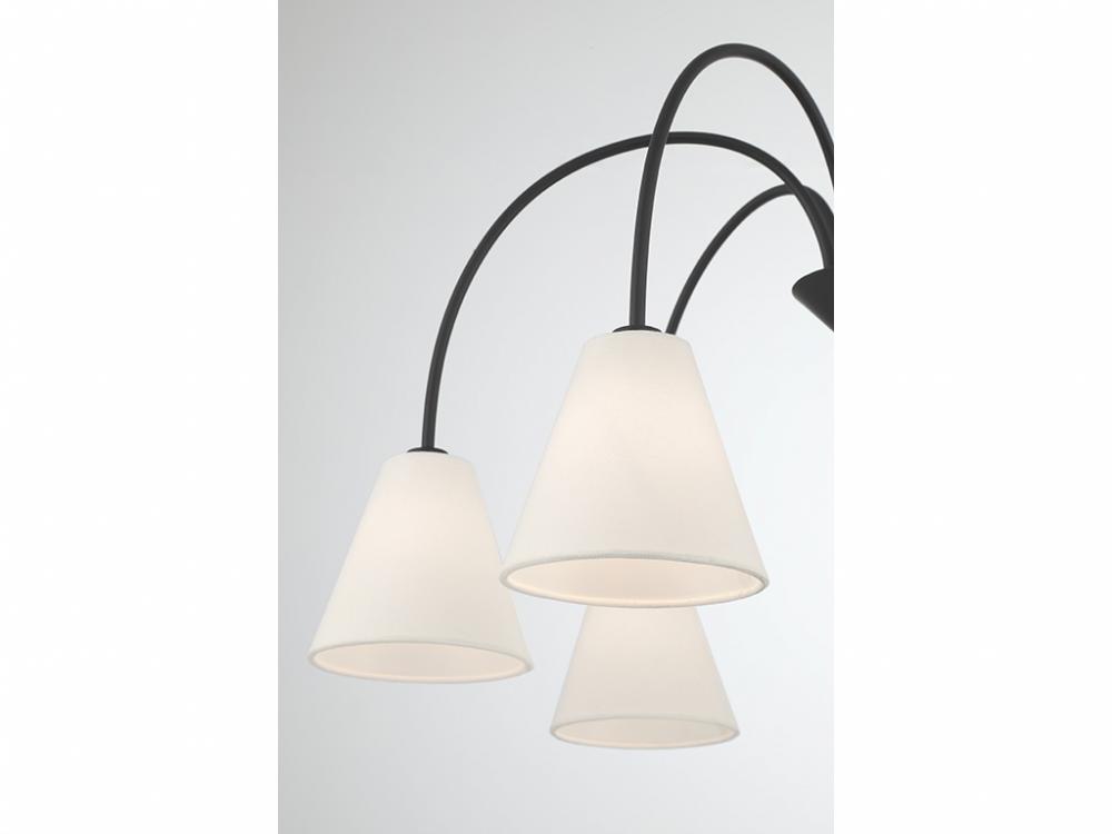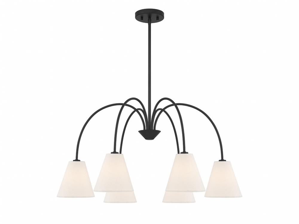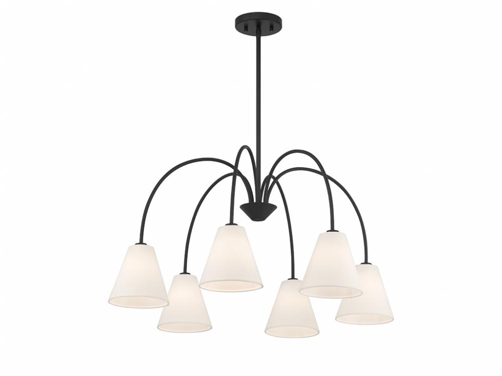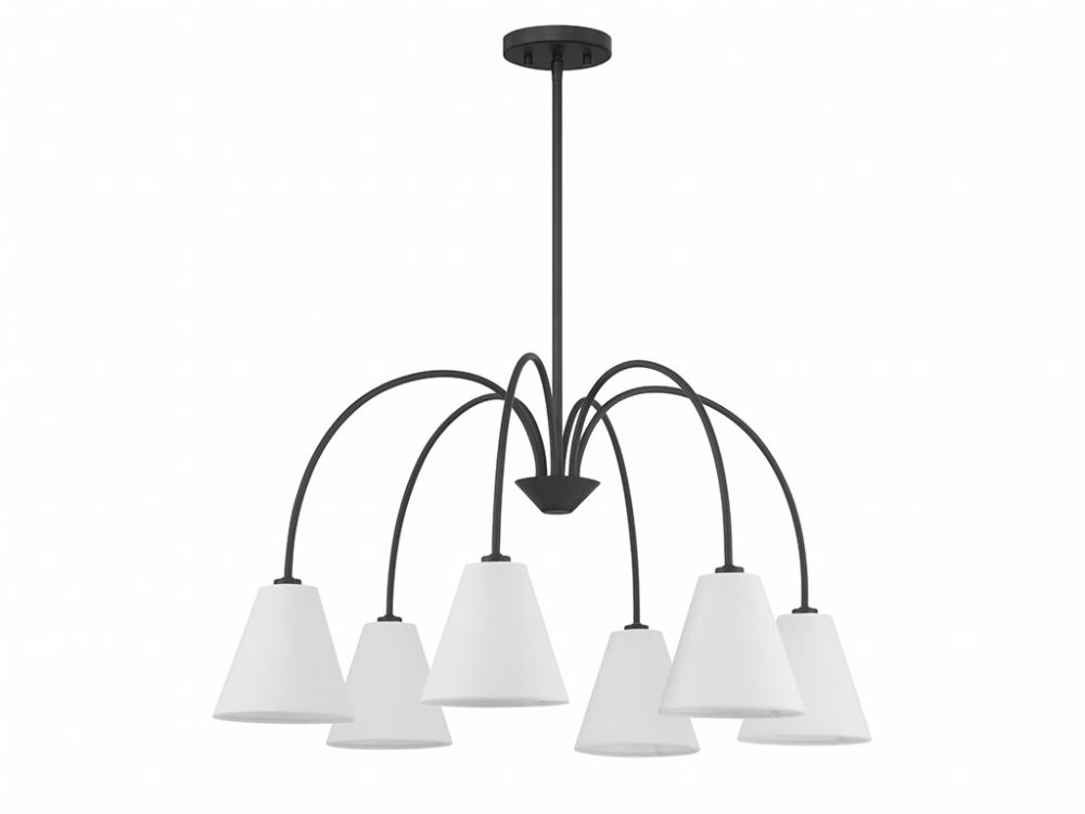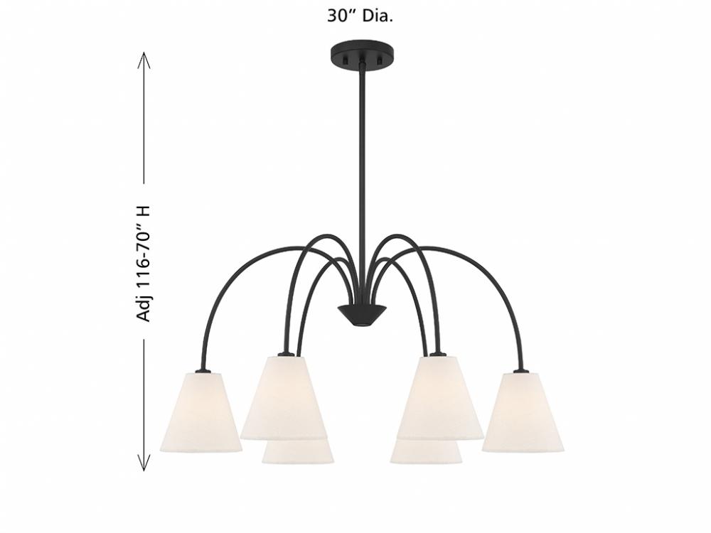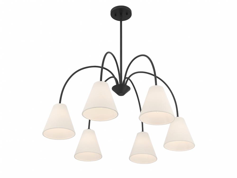 Style cascades down with the slender and curving arms of this 6-light chandelier, which are finished in Matte Black and decorated with white linen fabric shades. It has an adjustable height ranging from 16" to 70" and is 30" in width. It uses 6 candelabra size bulbs of up to 60 watts per bulb. Bulbs not included. Comes with four 12" downrods and one 6" downrod.