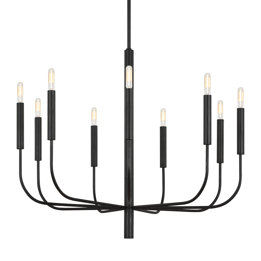 The Brianna nine light single-tier chandelier in aged iron enhances the beauty of your home with ample light and style to match today's trends. Brianna's graceful, seamless curvature and elongated tubular arms lend fluidity and modern appeal to this classic minimalist silhouette. Available in rich, gilded Burnished Brass and the more contemporary Polished Nickel finish. Brianna wall sconces include cylindrical shades in fresh White Linen.