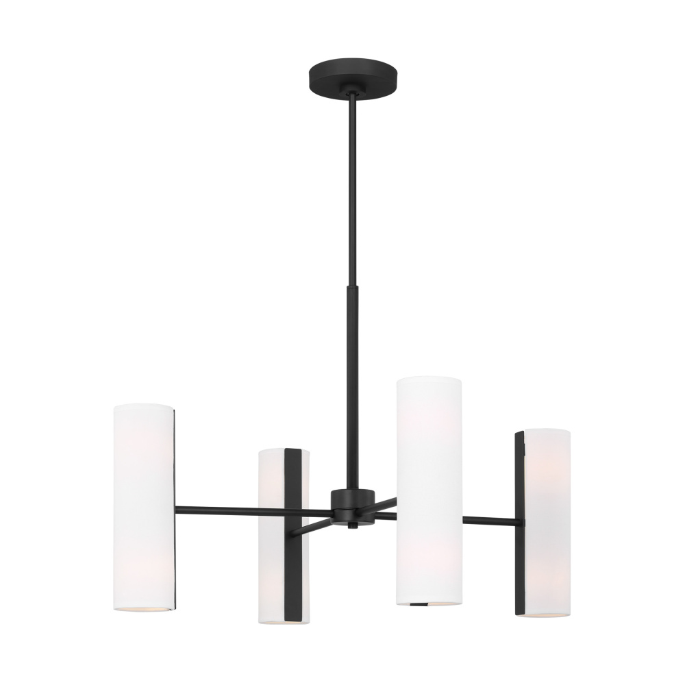 Sleek and modern, this contemporary collection features cylindrical linen shades and a visible flat spine for a clean look. It features a candelabra-style fixture with four sleek arms referencing mid-century modern design. On the end of each arm, frosted glass shades direct soft light in both directions.
