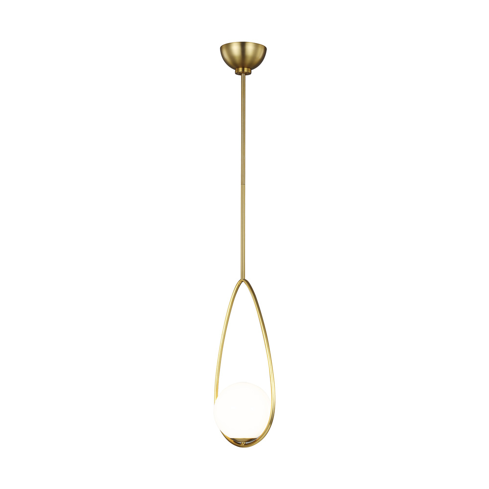 The Galassia one light single tier chandelier by AERIN in burnished brass balances glass globes on an elongated frame, which gives it a contemporary look. The white glass casts a soft, welcoming glow, while the elongated frame works particularly well in large, high-ceiling rooms.
