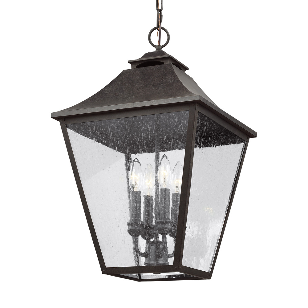 The Sean Lavin Galena four light outdoor pendant fixture in sable enhances the beauty of your property, makes your home safer and more secure, and increases the number of pleasurable hours you spend outdoors. Galena is a Europe-inspired classic lantern. Simple and refined, Galena features a gently curved hook detail atop a vented, square-off roofline, and candle tubes floating within the tapered clear glass shades. Galena is a warm, welcoming silhouette offered in our NEW Sable finish.