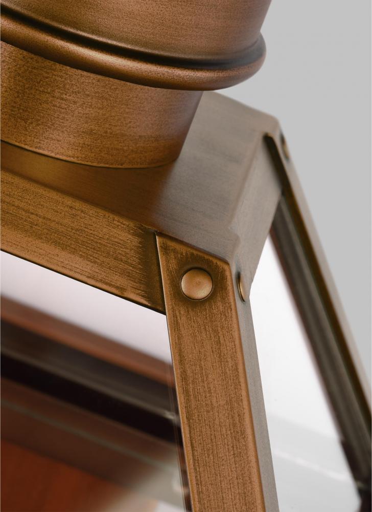 The Hyannis three light outdoor wall fixture in natural copper by Chapman & Myers has a classic copper lantern profile with top and bottom glass panels. Assembled with an overlapping metal frame which is accented by rivet details. Each light has a historically inspired spun metal chimney cap. The sconces are supported by a traditional bent metal architectural bracket.