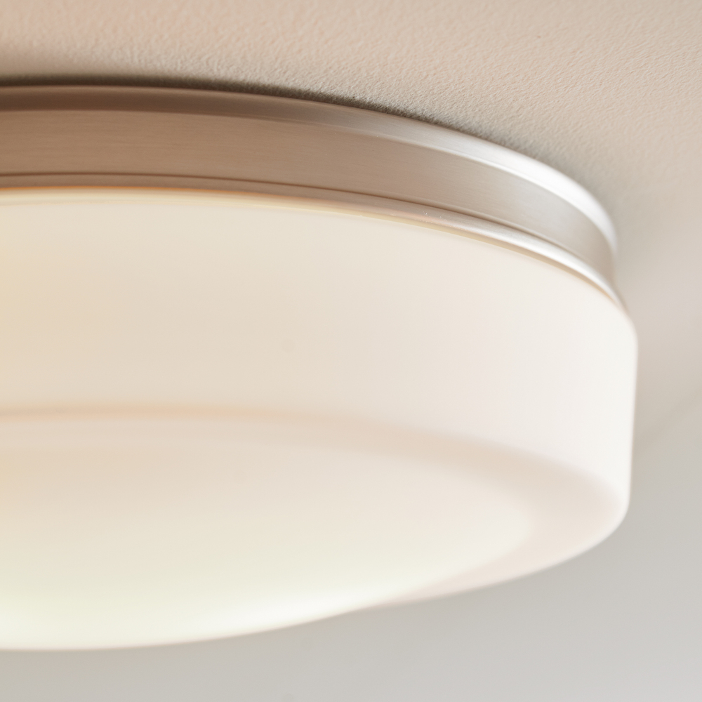 The Issen Flush Mount lighting collection uses a delicate, pressed, White Opal Etched glass diffuser, which is presented in a beautiful pattern representative of an emerald cut diamond and softly diffuses the light. Issen is available in three universally-appealing finishes – Chrome, Satin Nickel or Oil Rubbed Bronze - and adds a touch of elegance to surrounding decor. Issen fixtures are round with a 13.5" diameter, and are damp-rated, making them suitable for bathrooms or anywhere beautiful ceiling lighting is desired.