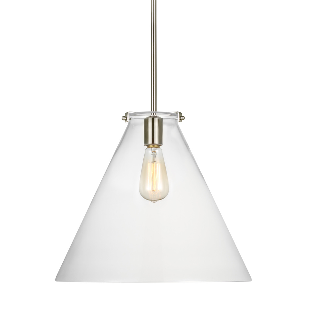 The Kate cone pendant is offered in the Satin Brass, Midnight Black, or Brushed Nickel finish. The flared, clear glass shade suspended from a linked chain defines sleek and simple, offering a chance to show-off any style bulb of your choice. The versatility of this fixture makes for a great transitional piece when changing your design or color themes.