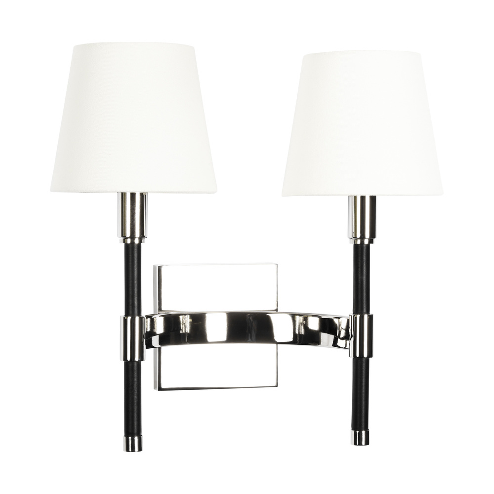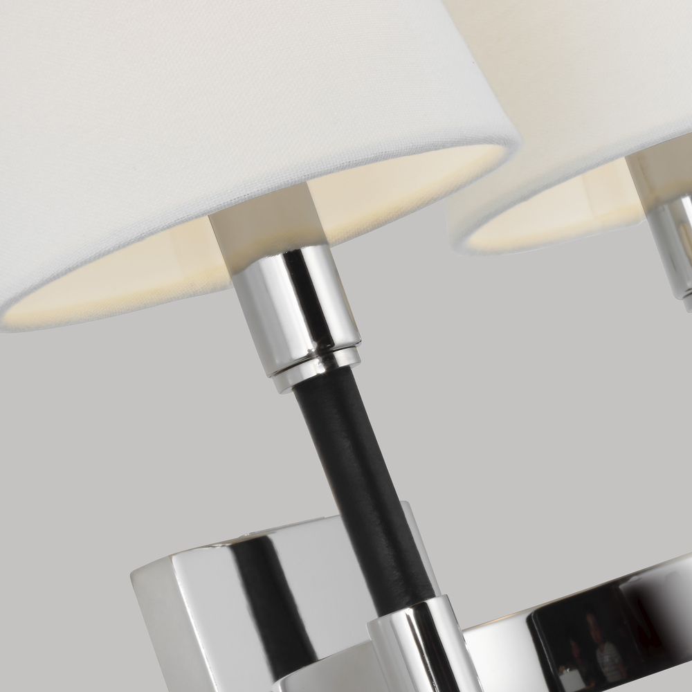In the Katie two light wall sconce leather stems contrast with metal and white linen fabric shade to round out a timeless design. Available in: Time Worn Brass with Brown Leather or Polished Nickel with Black Leather. The combination of leather and steel gives this round chandelier equestrian flair.