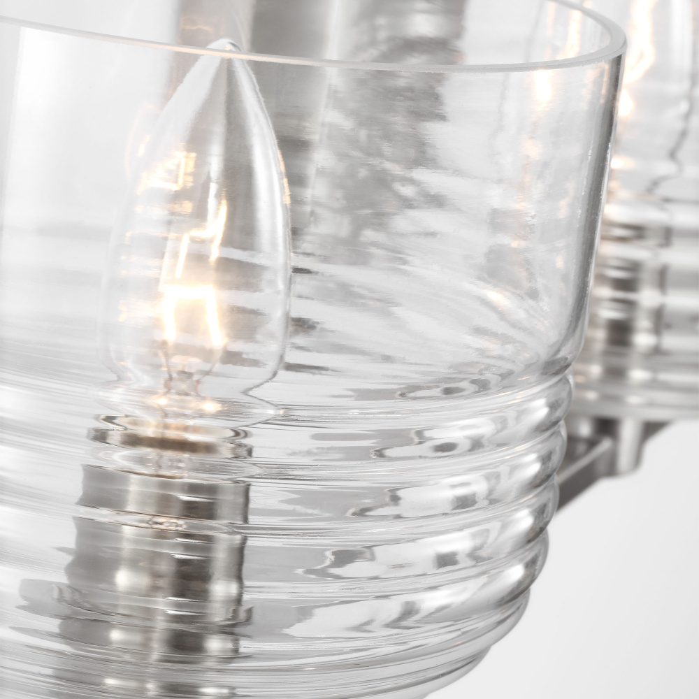 Crafted with Steel in a Brushed Nickel finish with clear ribbed glass shades