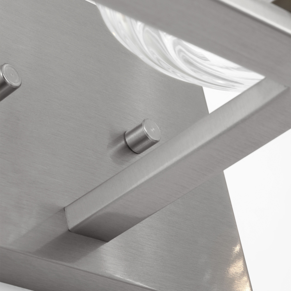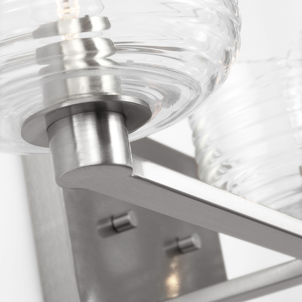 Crafted with Steel in a Brushed Nickel finish with clear ribbed glass shades