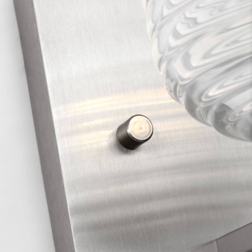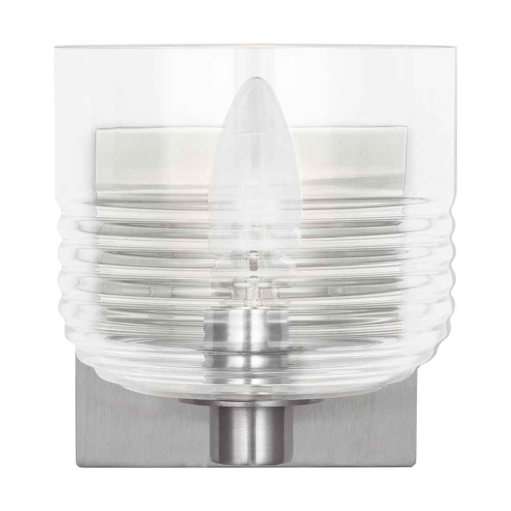 Crafted with Steel in a Brushed Nickel finish with clear ribbed glass shade
