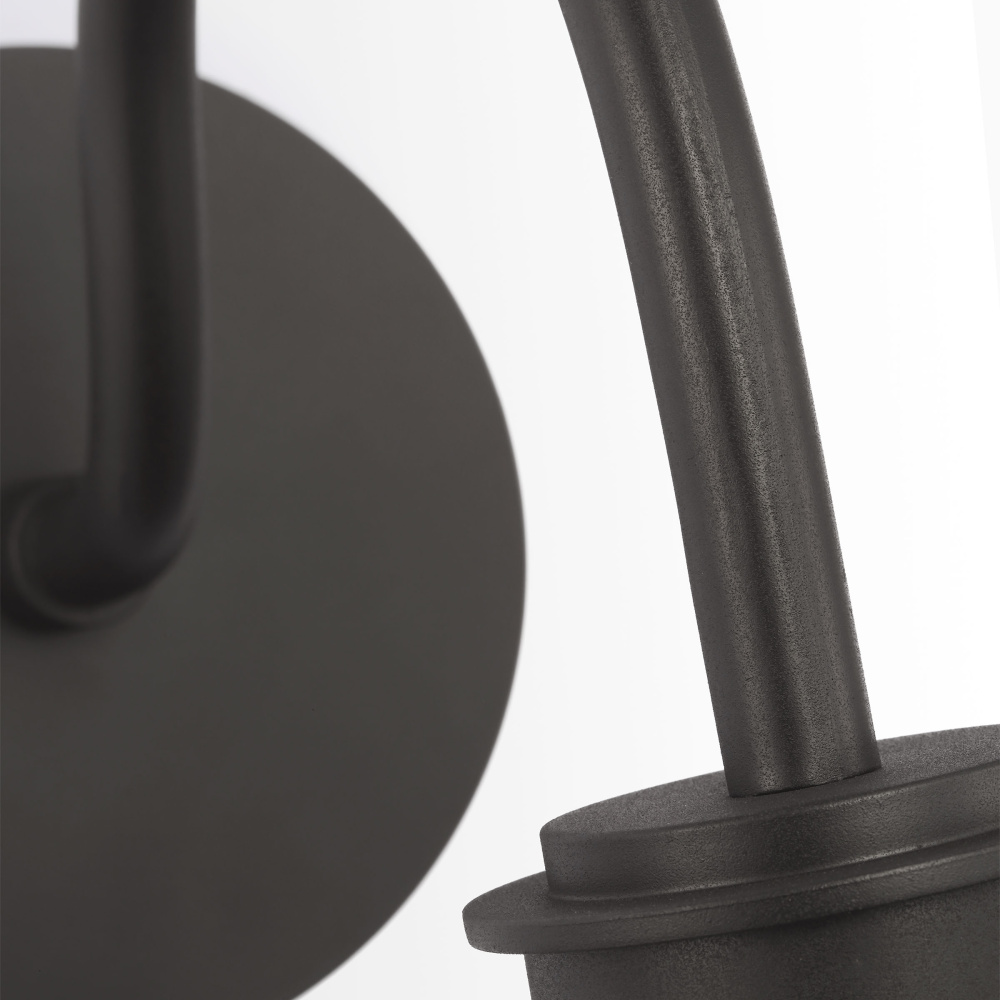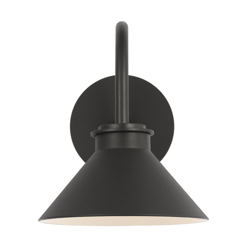 The Modern Barn Lights by Sean Lavin has a minimal silhouette and a textured Black finish, bringing a modern and industrial style to your main entrance. It's made from metal, and it hangs from a round back plate and a sleek, curved arm. The shade has a bell-shaped design that reminds us of classic barn lamps This elegant light is a beautiful and functional wall lantern with industrial accents, complementing porches, patios, and other outdoor areas.