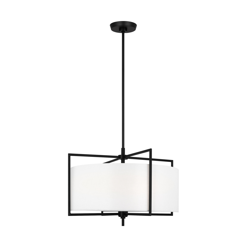 The Perno four-light shade pendant in Aged Iron by Chapman and Myers was inspired by a vintage mid-century French sconce with a simple metal armature. The minimal cruciform structure of the metal frame is the main feature of the design. The frame outlines and supports the inner cylindrical shade. All of the assembly hardware for installing the inner shade was engineered to be hidden in order to maintain the clean and simple aesthetic of the light.