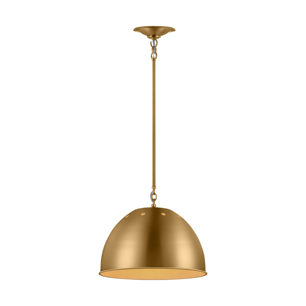 The Robbie pendants are a new enameled industrial metal shade pendant light designed by Thomas O'Brien. Robbie draws inspiration from the vintage factory-style shade with a ring of nice circular holes around the top of the dome. Special new metal fittings enhance this modern interpretation. Industrial-chic perforations along the top rim of the gleaming metal shade add charm to a classic design.