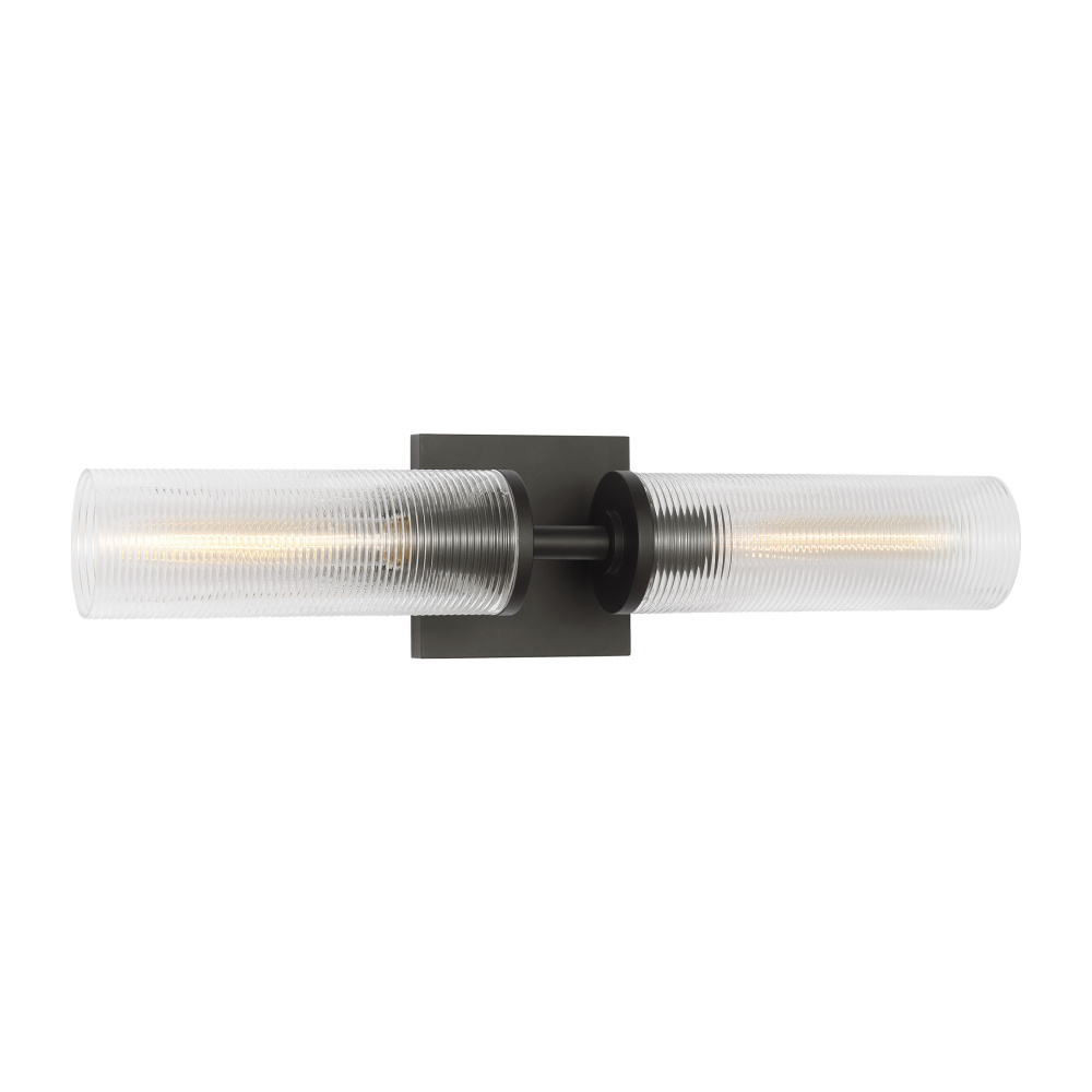 Modern aesthetic meets textural detail in the Sarita sconce by Drew & Jonathan. Ribbed glass completes the streamlined cylindrical forms while diffusing light and elegantly contrasting the bold square backplate. This sophisticated sconce will lend a subtle industrial accent and is ideal for bathrooms.