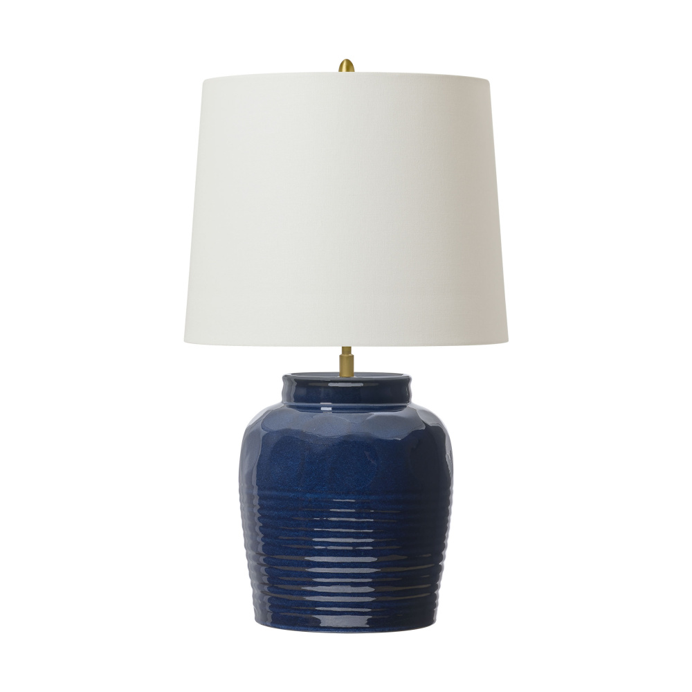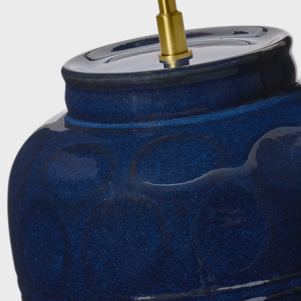 Crafted with Ceramic in a Mix Blue Brown finish with white linen fabric shade