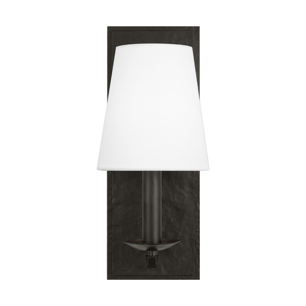 Crafted with Steel in a Aged Iron finish with white linen fabric shade