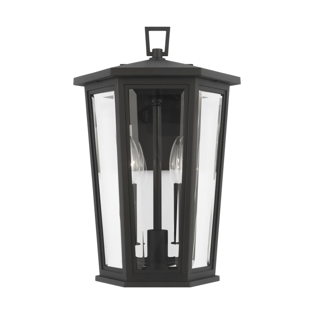 The Witley outdoor series by Sean Lavin Lighting is reminiscent of traditional outdoor oil lanterns with several individual panes of glass coming together to create facets that catch the light. Generous proportions in the Textured Black finish and Clear Beveled glass provide generous illumination to welcome guests and brighten passageways. The assortment includes mini, small, medium, large, and extra-large outdoor wall lanterns, a medium pendant, and a 3-light outdoor post lantern.